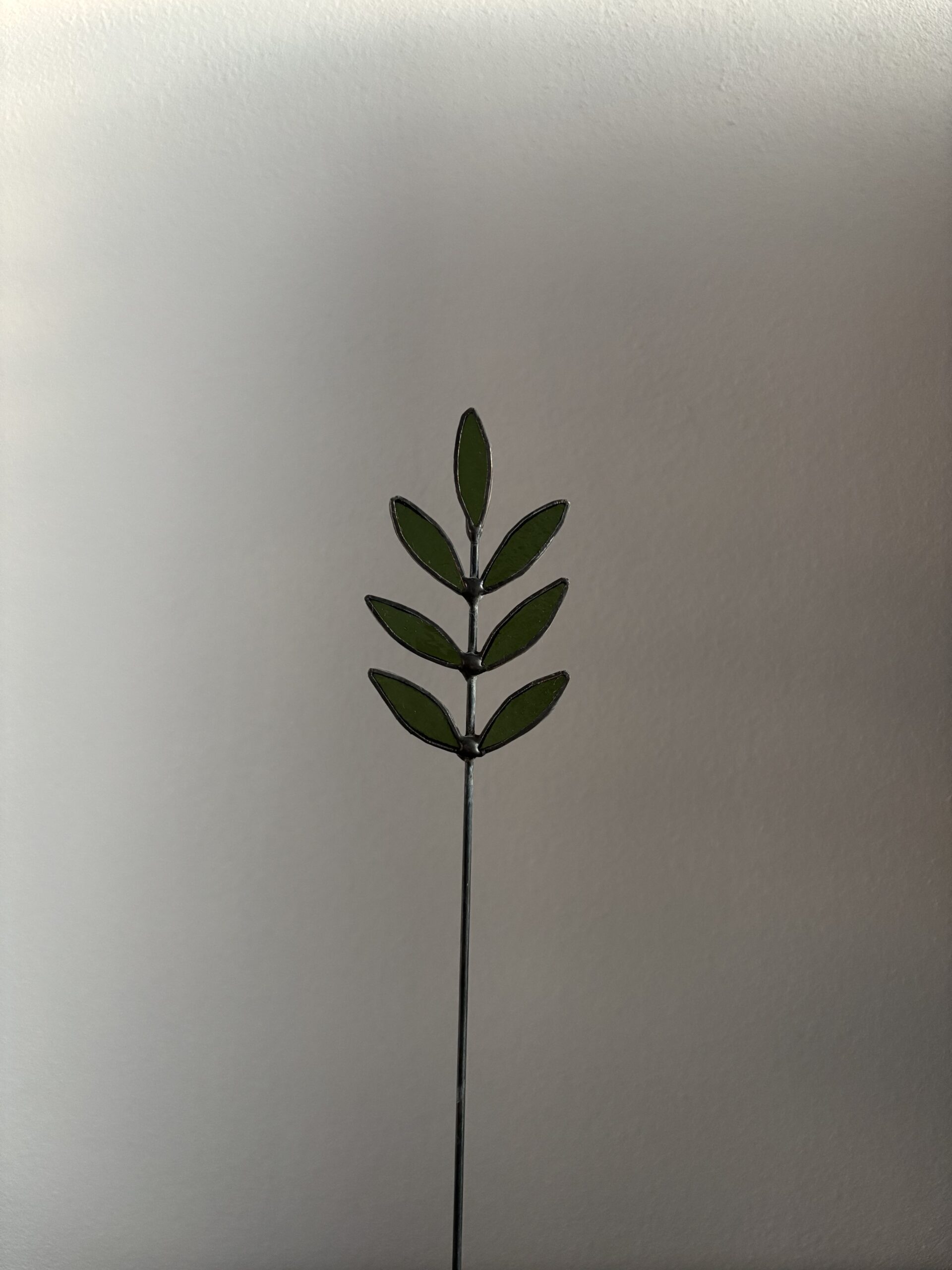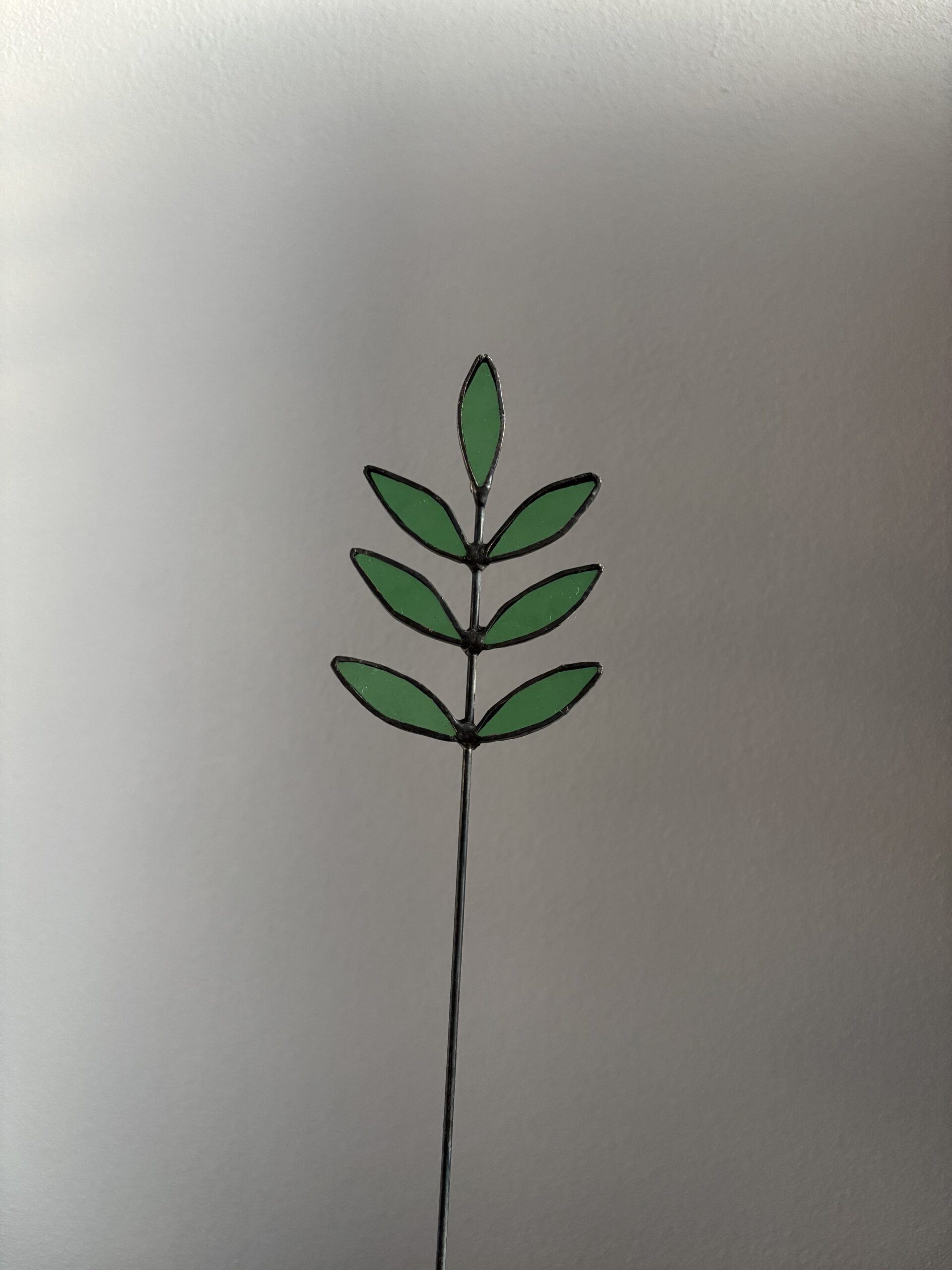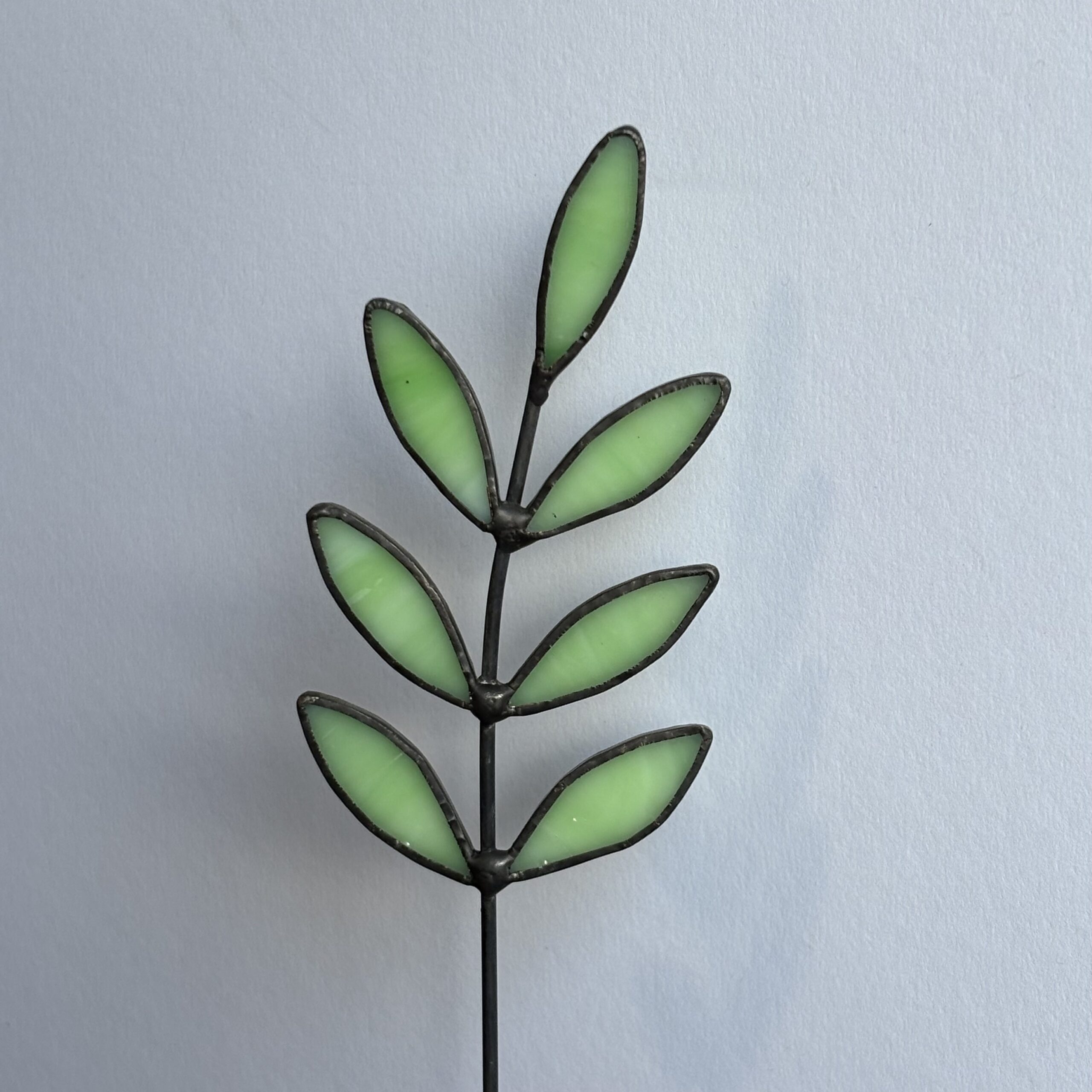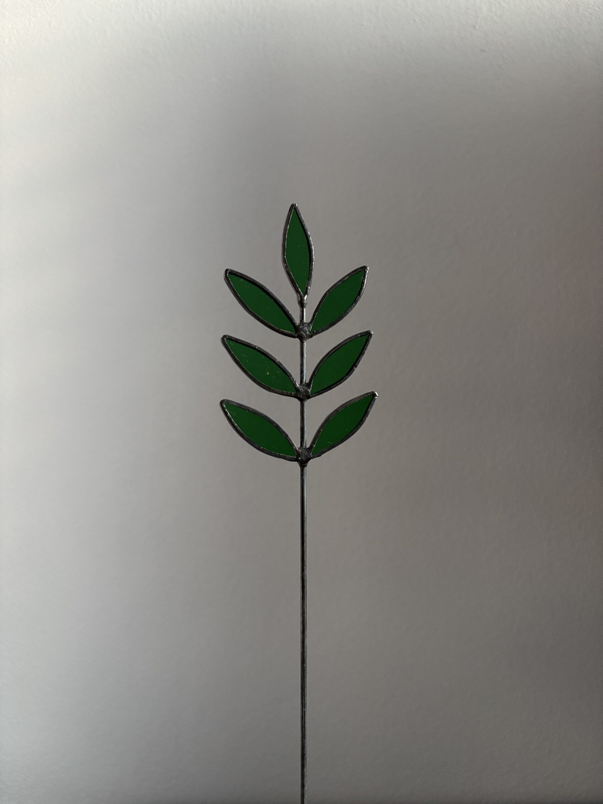 Dit prachtige Tiffany-stijl takje is een verfijnd decoratiestuk met zeven groene glazen blaadjes, omlijst door een donkere rand. Bij dit takje is gebruik gemaakt van doorschijnend en niet doorschijnend glas, waardoor beide soorten een unieke uitstraling krijgen. De slanke ijzeren steel maakt het eenvoudig te combineren met andere decoraties, in een vaas of als losstaand accent in je interieur.