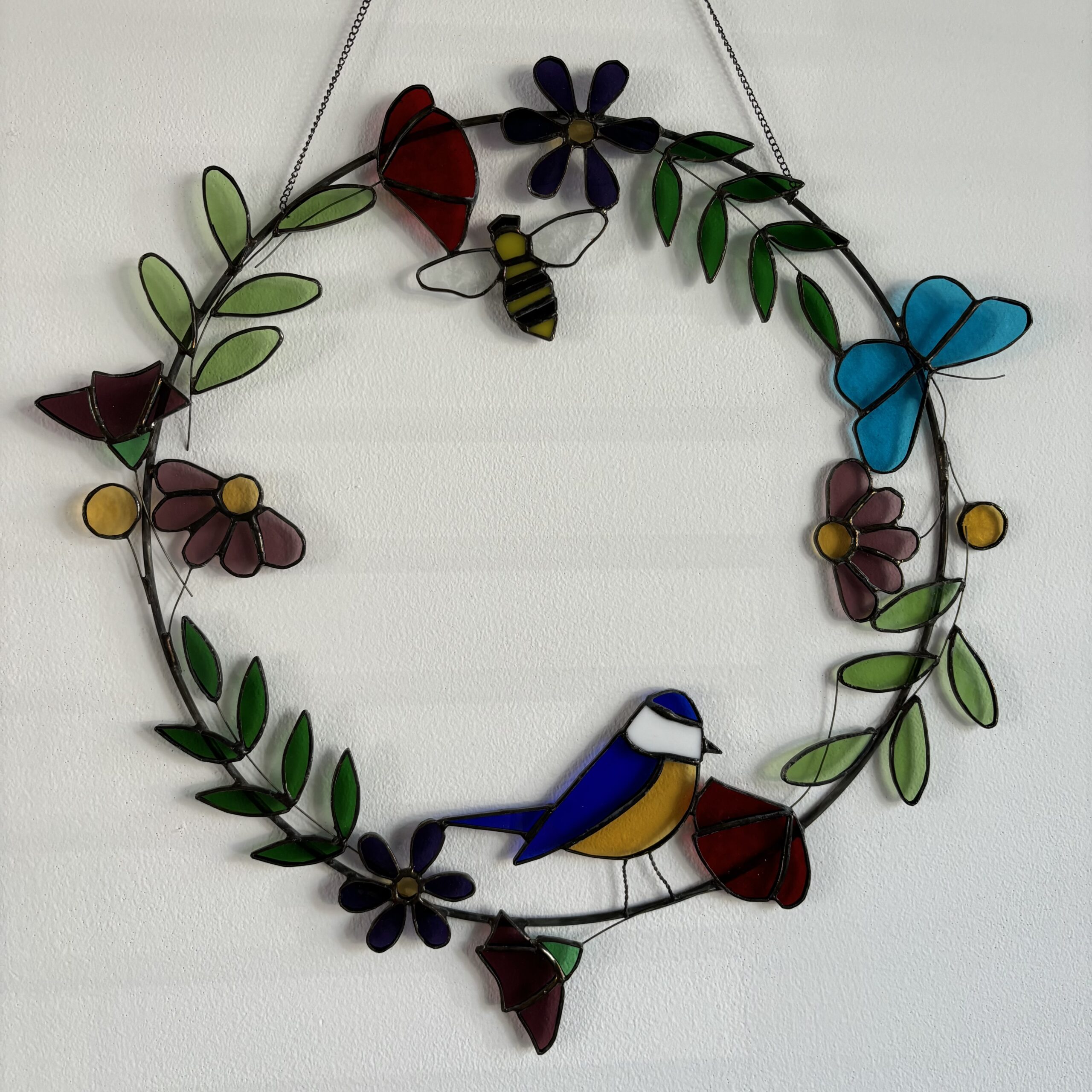 Deze betoverende Tiffany-hanger is een kunstwerk op zich, met een levendig ontwerp dat de pracht van de natuur vastlegt. Handgemaakt met oog voor detail en vervaardigd met de verfijnde Tiffany-techniek, combineert deze hanger bloemen, takken, een vogel, een bij en een vlinder in een harmonieuze en speelse compositie. De delicate bloemen en takken zijn sierlijk verweven, terwijl de vogel, bij en vlinder leven en beweging aan het ontwerp toevoegen. De bij vliegt van bloem naar bloem, en de vlinder fladdert elegant door het geheel, terwijl de vogel rustig toekijkt. Deze tijdloze hanger is een perfecte weerspiegeling van de natuurlijke schoonheid om ons heen. Het detailniveau van elk element maakt het een opvallend en bijzonder product, ideaal voor de liefhebber van natuur en kunst. De ring heeft een diameter van 30 centimeter.