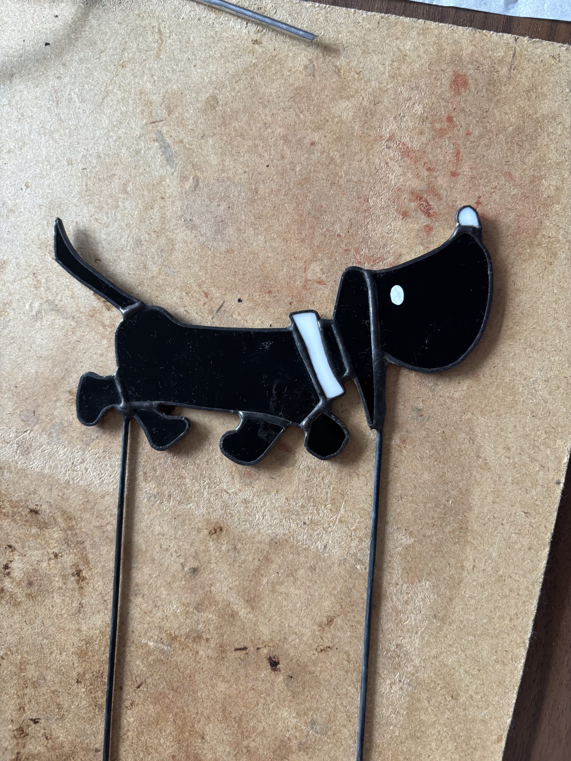 Elke Takkie maak ik met de hand, volgens de traditionele Tiffany-techniek. Ik snijd het glas zorgvuldig op maat, omwikkel elk stukje met koperfolie en soldeer het tot een stevig geheel. Het herkenbare silhouet van Takkie – in zwart en wit glas – rust op een stevig metalen steeltje.