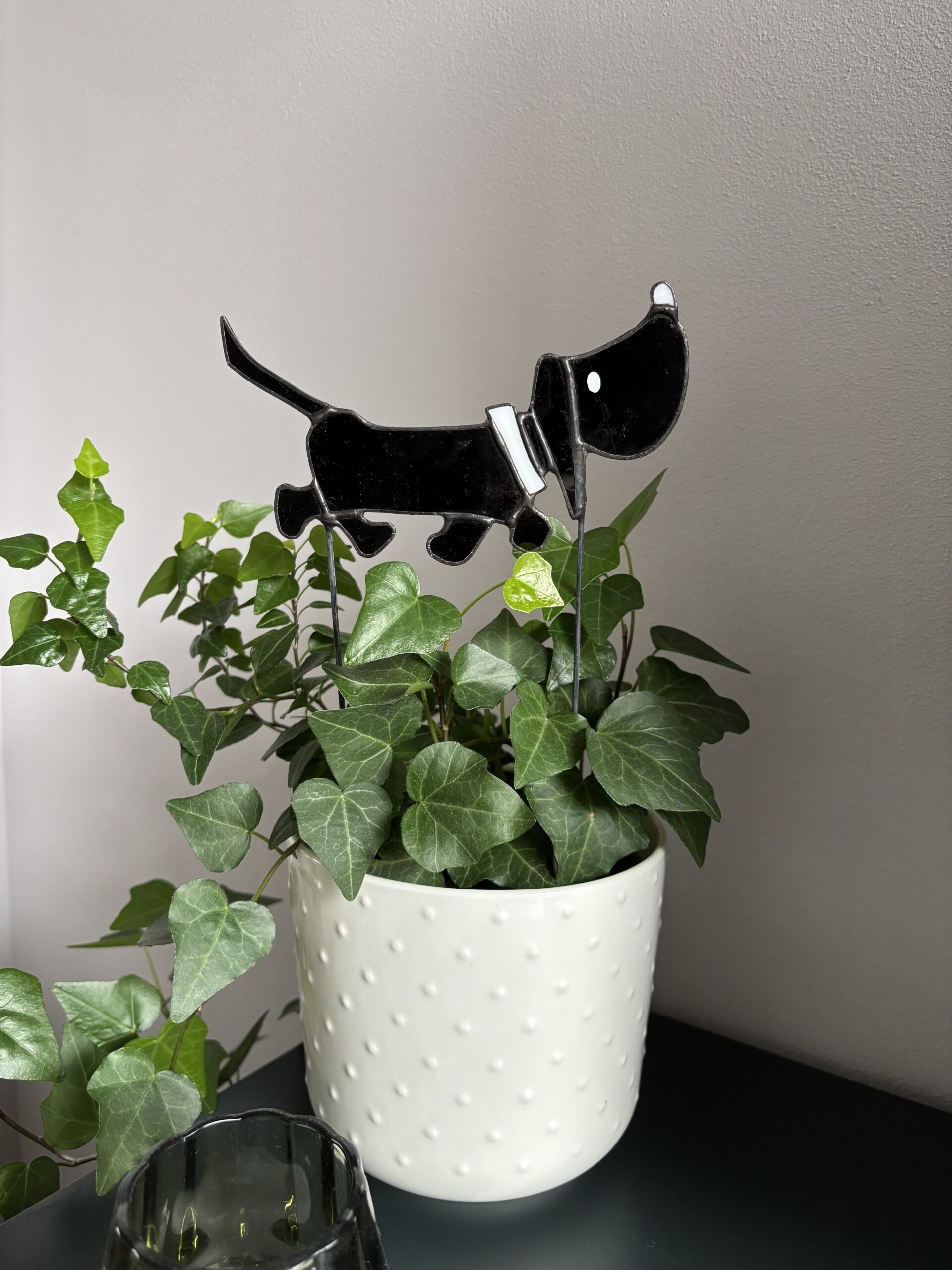 Breng een glimlach in huis met deze Glas-in-lood / Tiffany “Takkie” op steeltje – een handgemaakt glaskunstwerkje geïnspireerd op het geliefde hondje uit Jip en Janneke. Deze decoratieve prikker voegt een speelse én stijlvolle touch toe aan je kamerplant, of staat charmant op een houten voetje.